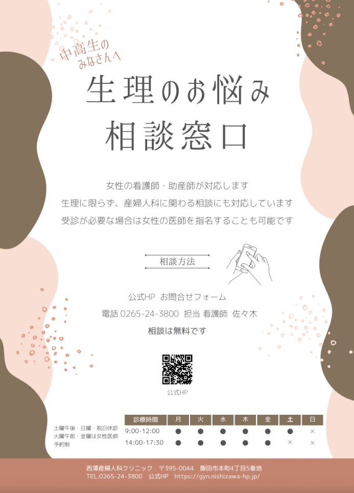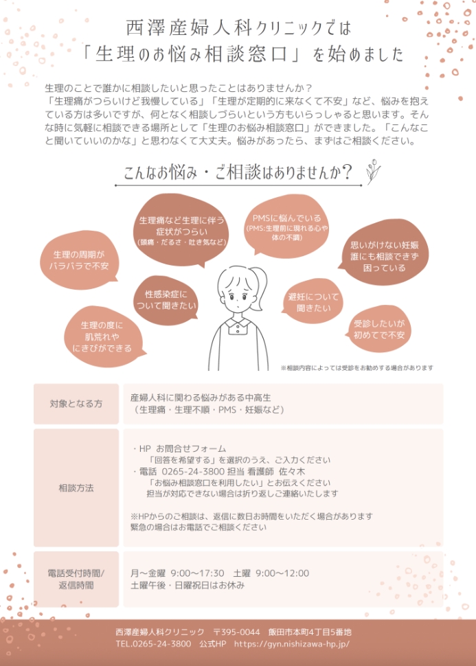 飯田下伊那地域の中高生を対象とした「生理のお悩み相談窓口」を始めました。生理以外にも、産婦人科に関わる相談に対応いたします。詳細はパンフレットをご確認ください。